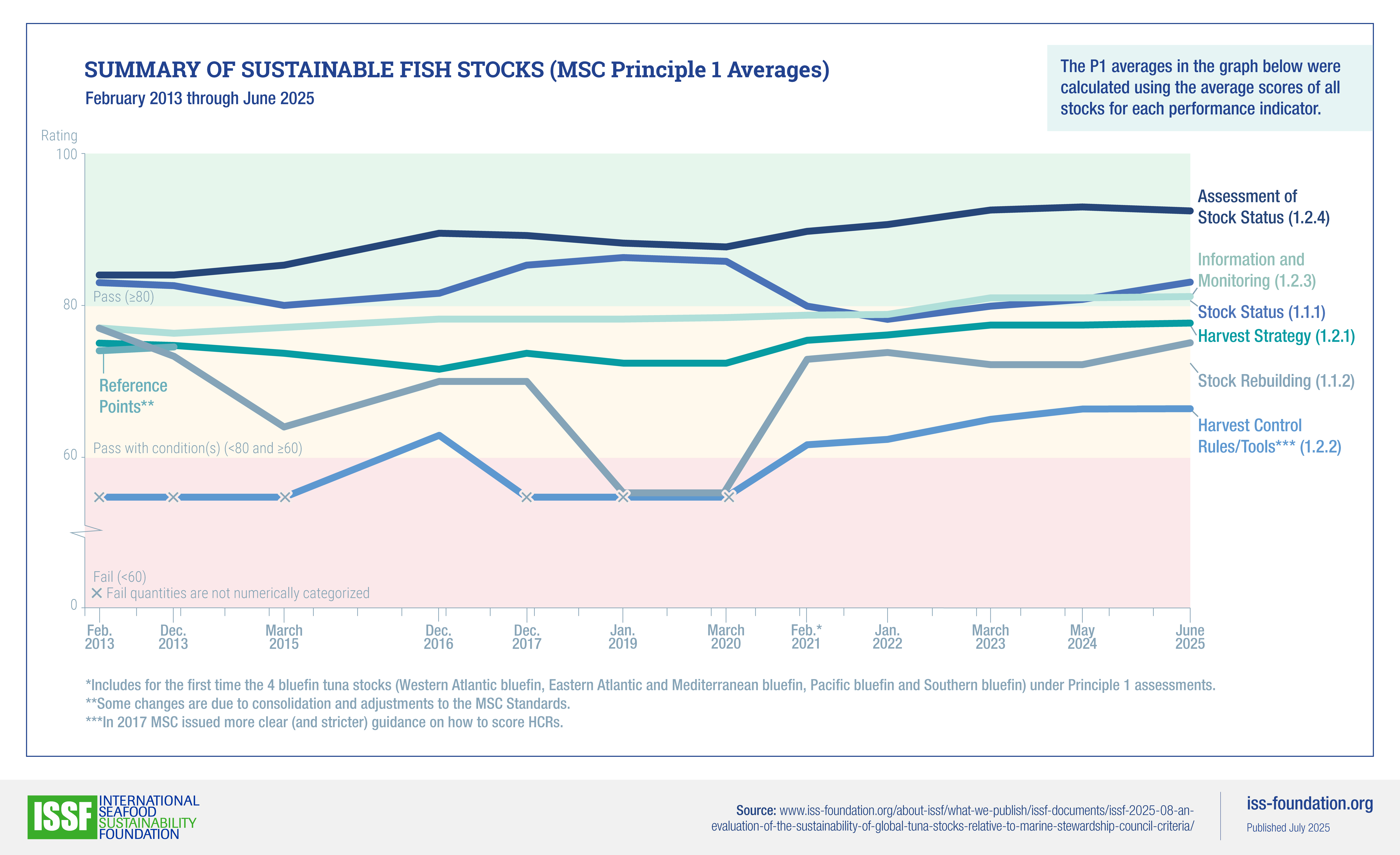 The 2025 ISSF report with P1 and P3 scores, ISSF 2025-08: An Evaluation of the Sustainability of Global Tuna Stocks Relative to Marine Stewardship Council Criteria, is authored by Matthew Cieri, Geir Hönneland, Paul A.H. Medley, and Susan Singh-Renton.