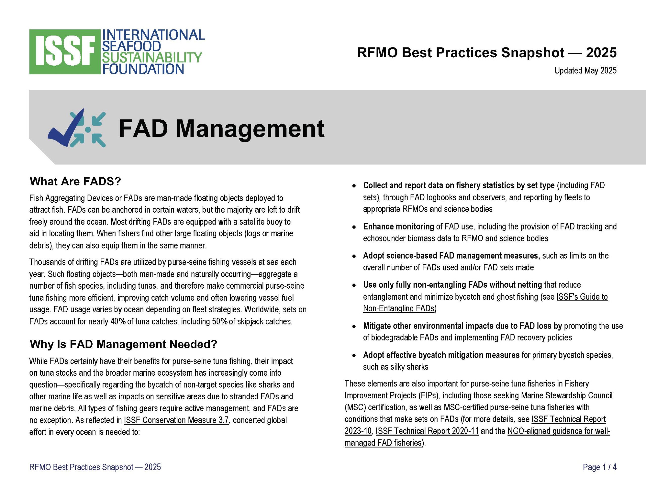 ISSF believes that FAD fishing can be made more sustainable if FADs are built to be non-entangling as well as biodegradable. FADs also must be well managed by fleets and well monitored by Regional Fisheries Management Organizations (RFMOs) and other oversight agencies. FAD retrieval after fishing is essential for sustainable FAD management.