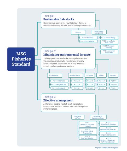 This graphic shows the Principles and PIs in MSC Fisheries Standard, which are used to assess fisheries for certification.