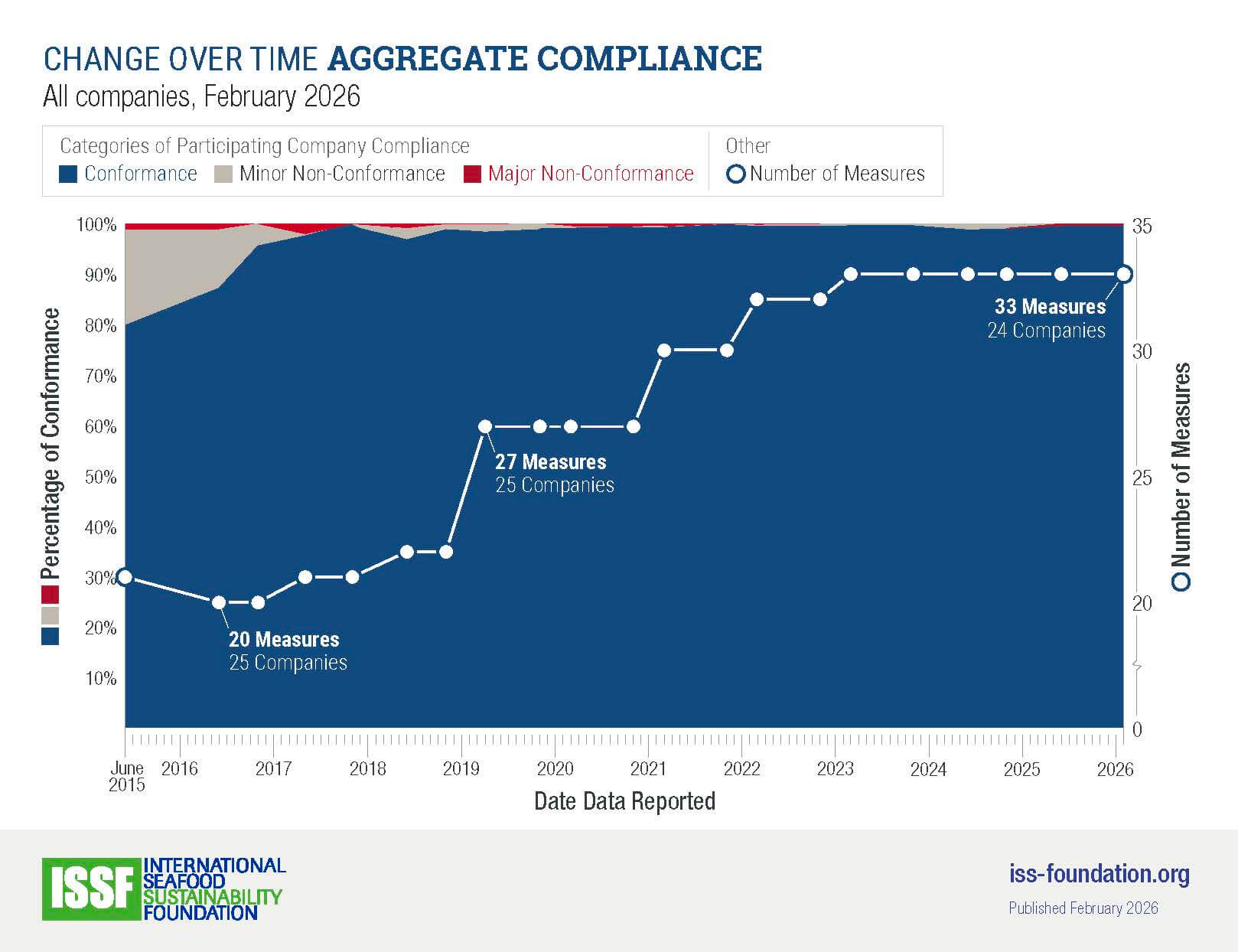 This graphic tracks compliance based on data published in the Update to ISSF Annual Conservation Measures & ProActive Vessel Register Compliance Report (February 2026) (PDF).