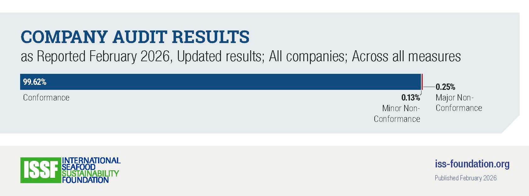 This bar chart, created in February 2026, shows the percentage of ISSF participating companies that are in conformance, minor non-conformance, or major non-conformance with ISSF conservation measures, based on data published in the Update to ISSF Annual Conservation Measures & ProActive Vessel Register Compliance Report (February 2026) (PDF).
