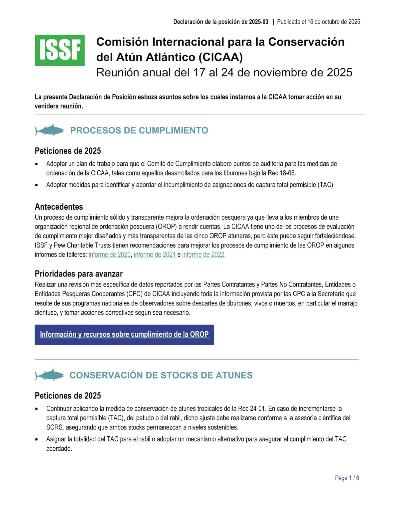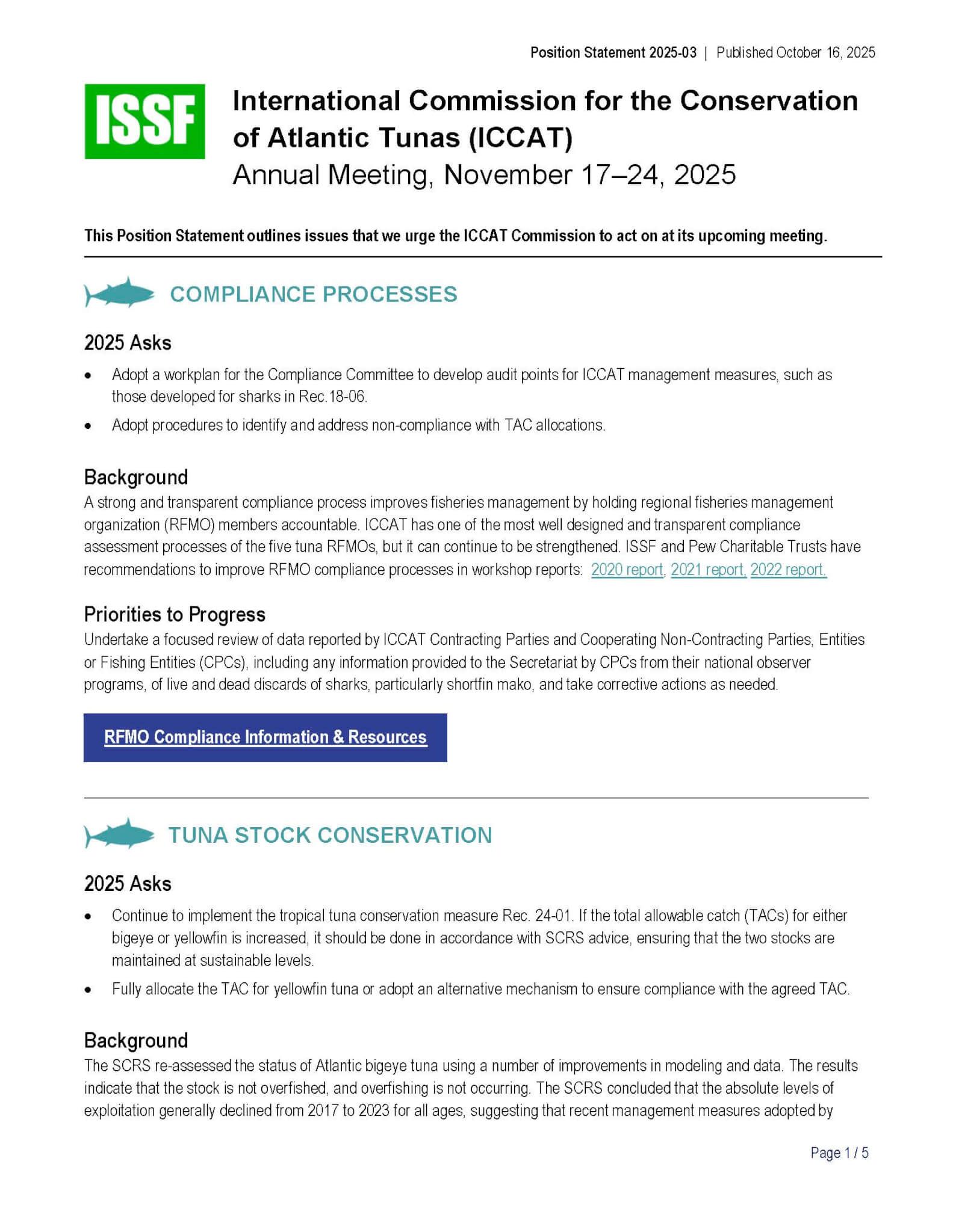 La déclaration couvre des sujets dans ces catégories: processus de conformité; conservation des ressources en thon; gestion des dispositifs de concentration de poissons (DCP); présence d’observateurs et monitoring électronique (ME); réglementations régissant les transbordements; procédures de gestion efficaces (stratégies d’exploitation); réduction des prises accessoires mesures de protection des requins; et la capacité. La déclaration comprend les principales « demandes » de l’ISSF ou demandes de CICTA.