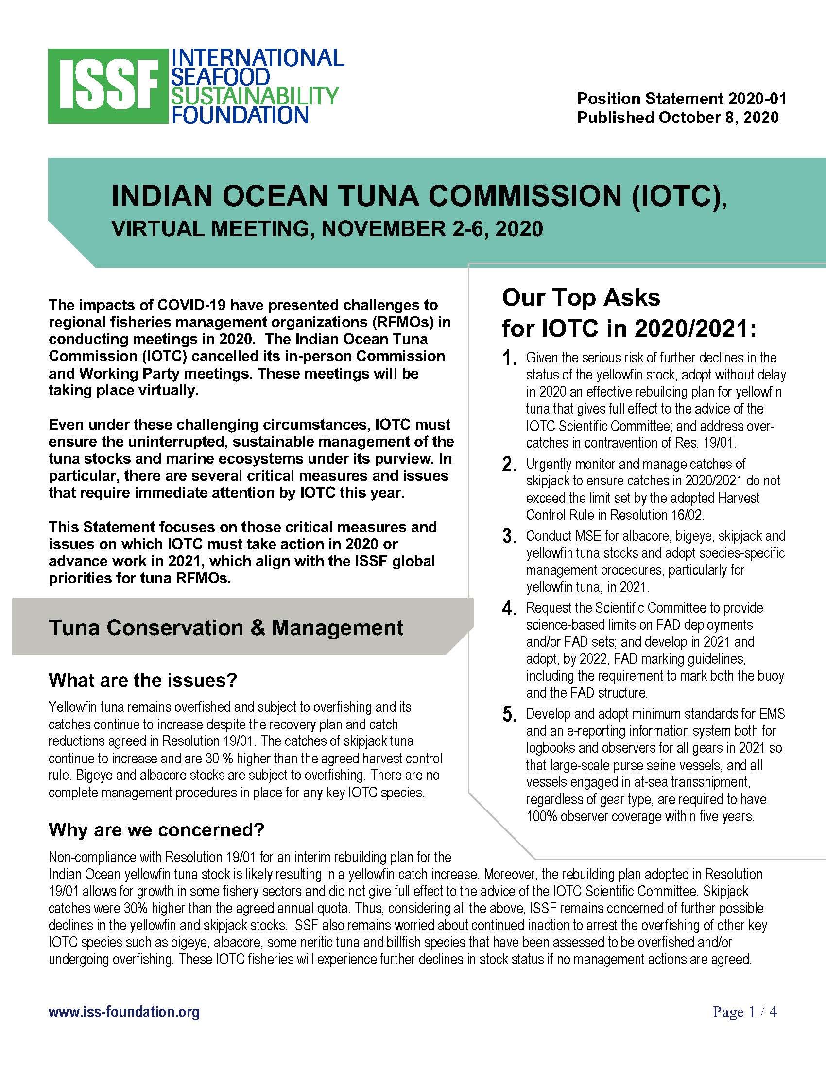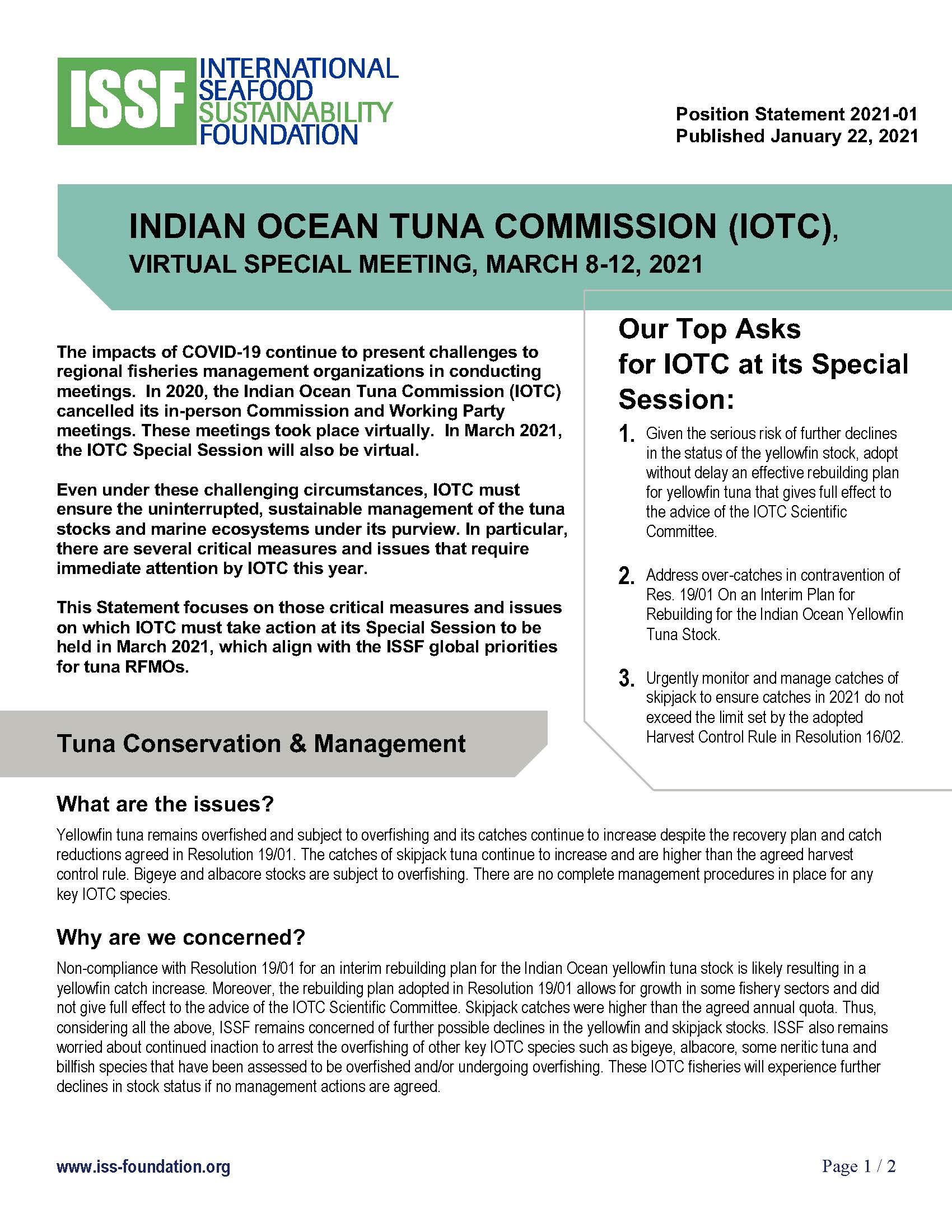 This ISSF position statement focuses on critical measures and issues on which the Indian Ocean Tuna Commission (IOTC) must take action at its Special Session on March 8-12, 2021, which align with the ISSF global priorities for tuna RFMOs.